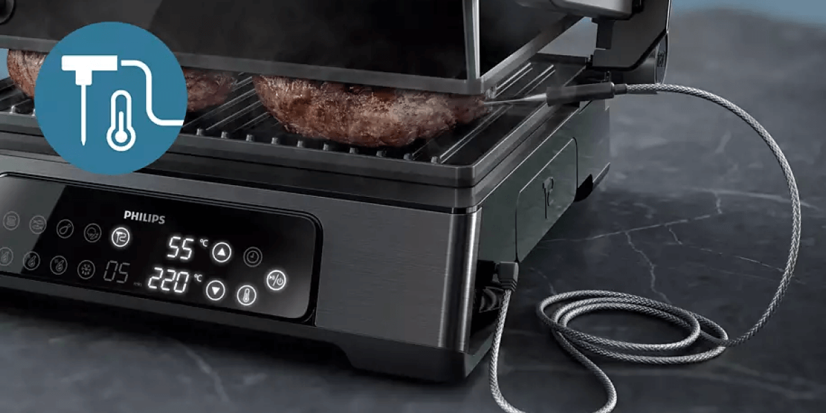 Під час приготування м'яса на грилі, особливо стейків, для багатьох людей найважливішим є ступінь просмаження. На щастя, з Philips Series 7000 HD6307/70 ви маєте можливість готувати їжу з неймовірною точністю! Гриль обладнаний датчиком, який постійно вимірює температуру всередині м'яса. Отже, ви точно знатимете, коли зніматимете страву з гриля та подаватимете її гостям!